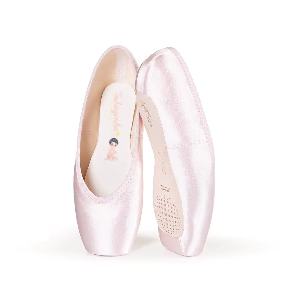 TOSHIEZINHA – Primeira Sapatilha de Ponta para Iniciantes. Com decote “V” e fôrma idêntica à da Toshie, box e asas laterais menores e mais macios, além de palmilha inteira e muito macia, facilitando à aluna passar pela meia-ponta para chegar na ponta, aspecto fundamental para iniciantes. Personagem Toshiezinha estampada na sobrepalmilha.