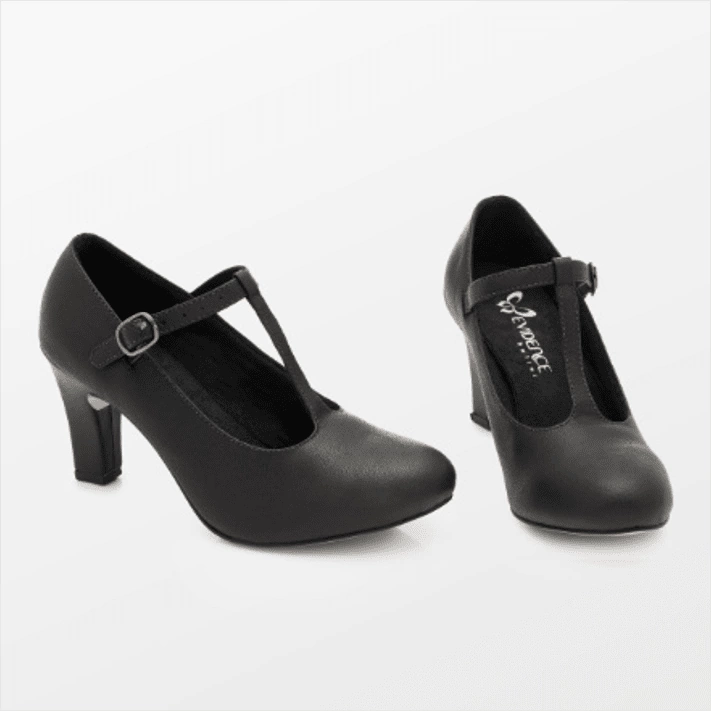 Sapato de dança feminino com correia e fivela, fechado com tiras sobre colo de pé, trazendo elegância. Sobre palmilha acolchoada e forro em camurça.